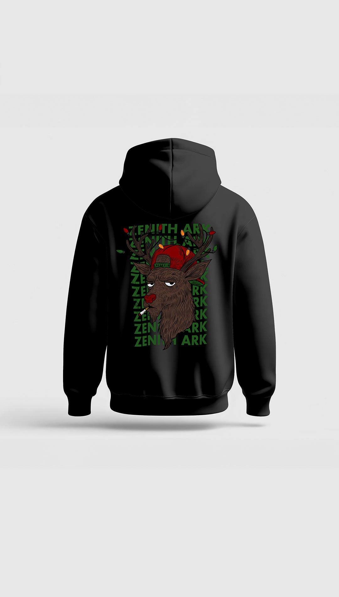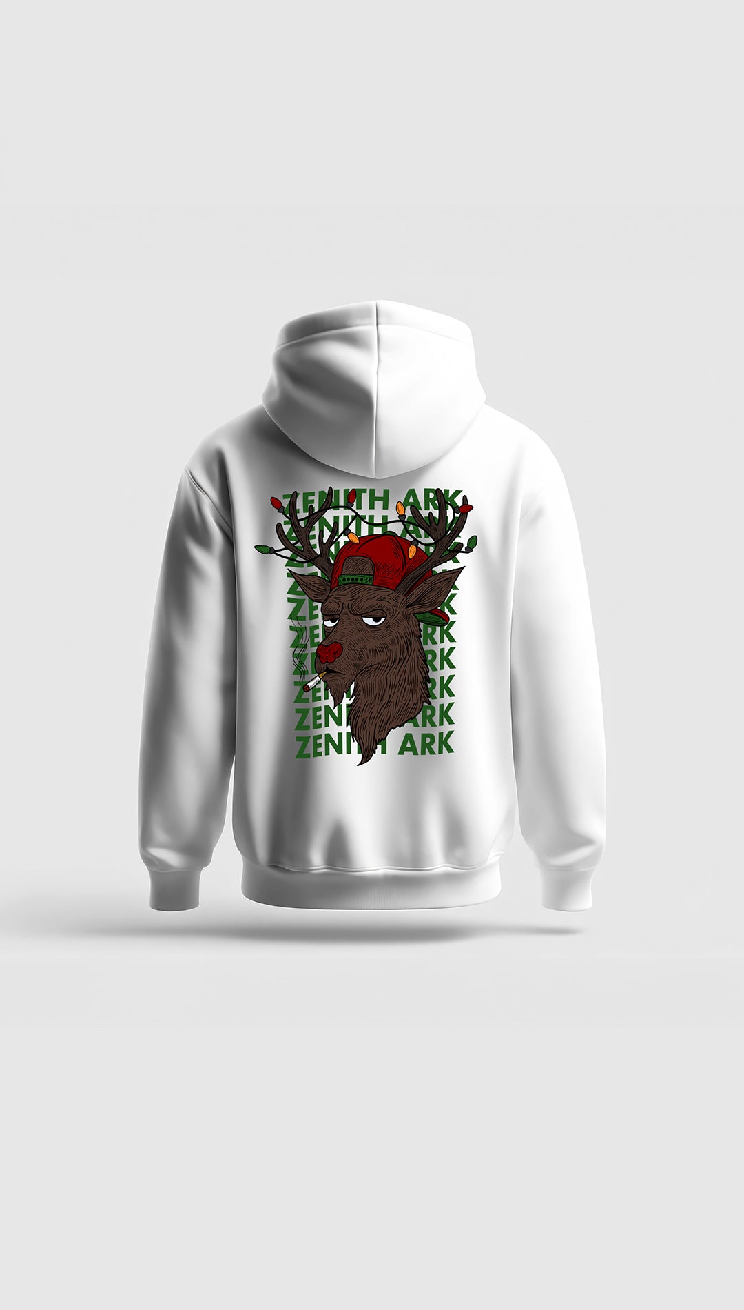 Hoodie-ul „Renu' Cool” aduce spiritul de Crăciun în zona de streetwear, decorat cu instalații colorate și snapback roșu peste fundalul verde ZENITH ARK.