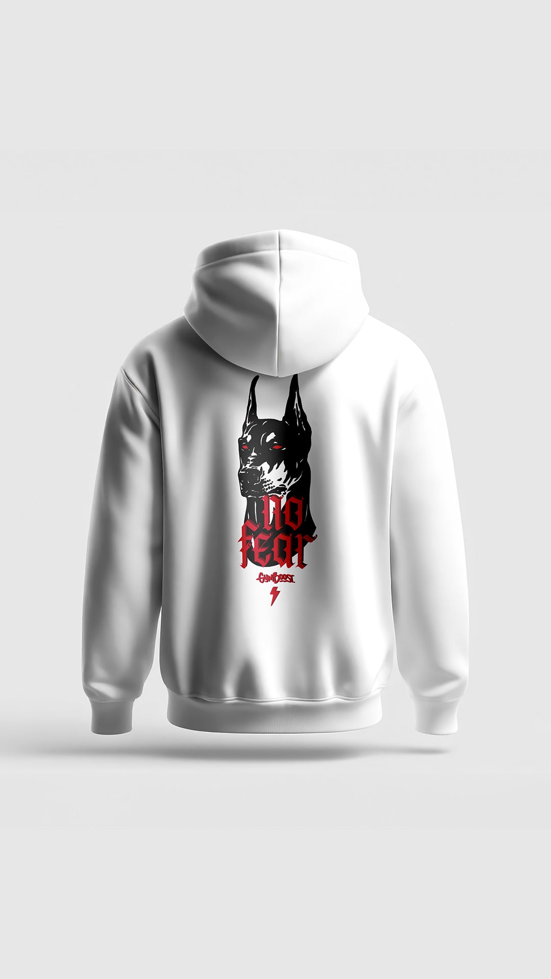 Pe un fundal alb, mesajul "NoFear" și imaginea unui doberman, simbol al puterii și loialității, reflectă perfect curajul și determinarea ta.